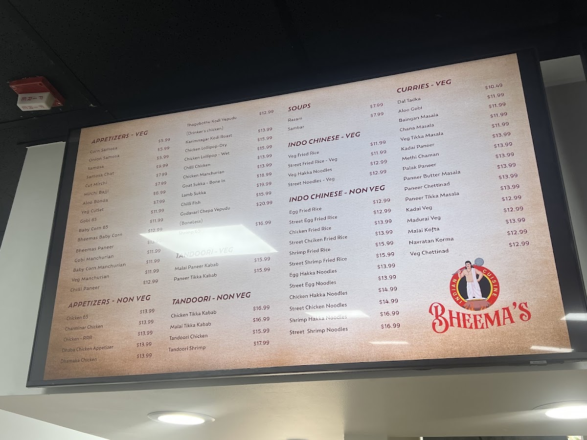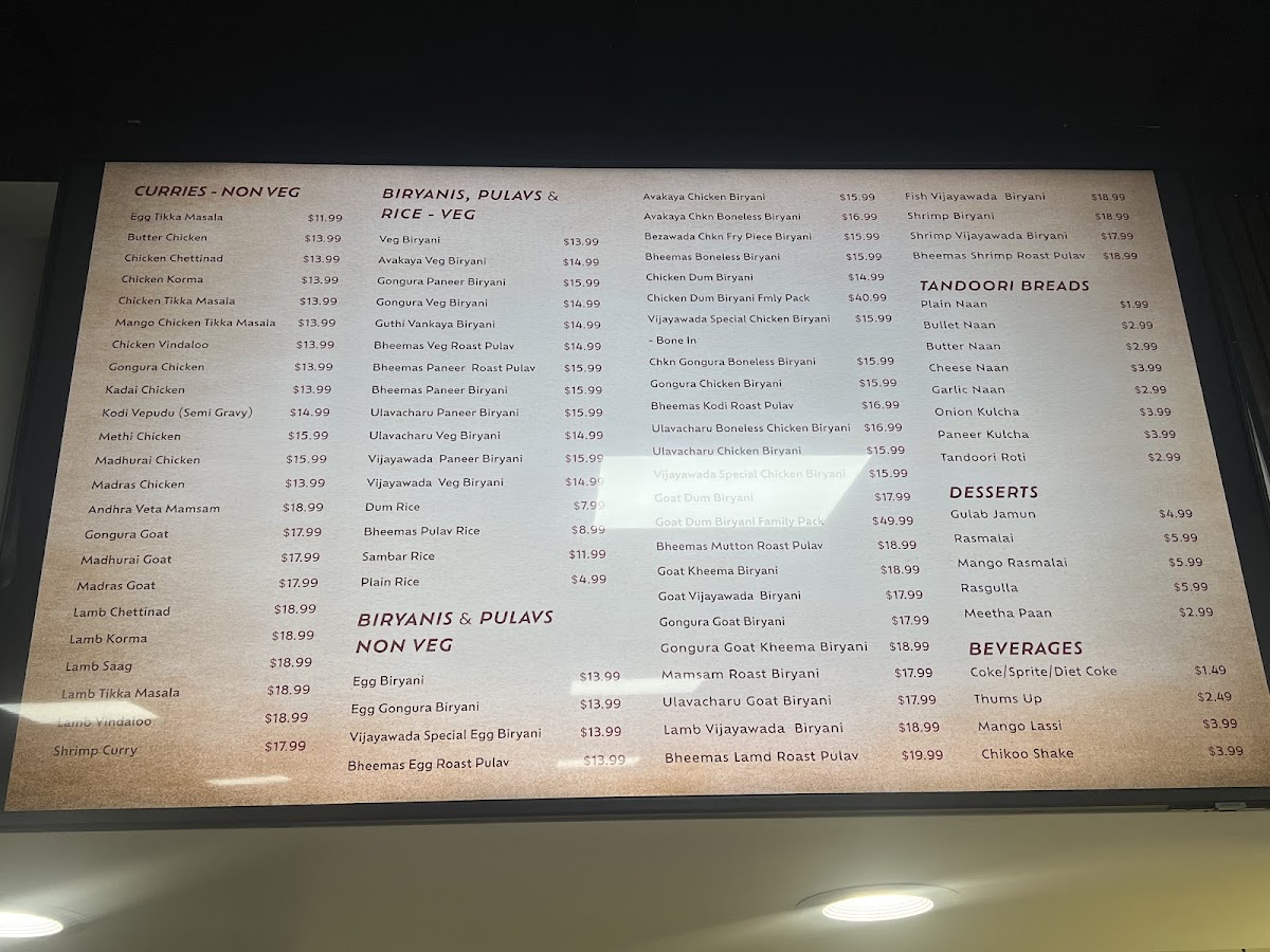 From a reviewer’s perspective, the menu at Bheema's Indian Cuisine feels like a well-rounded celebration of classic Indian flavors with a few comforting Indo-Chinese touches, making it easy to find something for every palate. Starting with beverages such as Diet Coke, Coke, Sprite, Bottled Water, and the traditional Chikoo Shake, the menu sets a relaxed, casual tone. The tandoori bread selection is a definite highlight, with soft and aromatic options like Plain Naan, Garlic Naan, Cheese Naan, Tandoori Roti, Bullet Naan, and Butter Naan, all perfect for scooping up rich curries. Vegetarian tandoori starters such as Paneer Tikka Kabab and Malai Tikka Kabab (Paneer) showcase smoky flavors and creamy marinades, while veg curries like Baingan Masala, Kadai Veg, Methi Chaman, Navratan Korma, and Chana Masala offer depth and comforting spice. Non-vegetarian lovers are well served with bold dishes such as Lamb Vindaloo and aromatic rice plates like Bheemas Boneless Biryani, Gongura Chicken Biryani, Shrimp Biryani, Vijayawada Special Egg Biryani, and Bheemas Egg Roast Pulao. The vegetarian rice section is equally impressive, featuring Vijayawada Veg Biryani, Veg Dum Biryani, Guthi Vankaya Biryani, Avakai Veg Biryani, and Bagara Rice, along with specials like Bheemas Veg Roast Pulao and Bheemas Paneer Biryani. For those craving Indo-Chinese comfort food, choices such as Veg Fried Rice, Veg Hakka Noodles, Street Veg Fried Rice, Chicken Fried Rice, Chicken Hakka Noodles, Egg Hakka Noodles, and Street Shrimp Hakka Noodles add variety, while soups like Rasam and Sambar bring warmth. Rounding things out are appetizers including Samosa Chaat, Mirchi Bajji, Gobi 65, Bheemas Baby Corn, and Cut Mirchi, making the menu feel complete, satisfying, and thoughtfully curated as a whole.